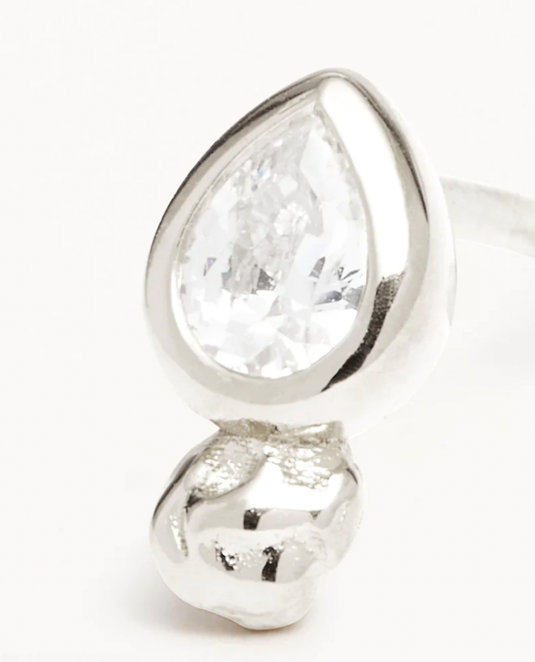 - Features pear-cut cubic zirconias in a bezel setting.