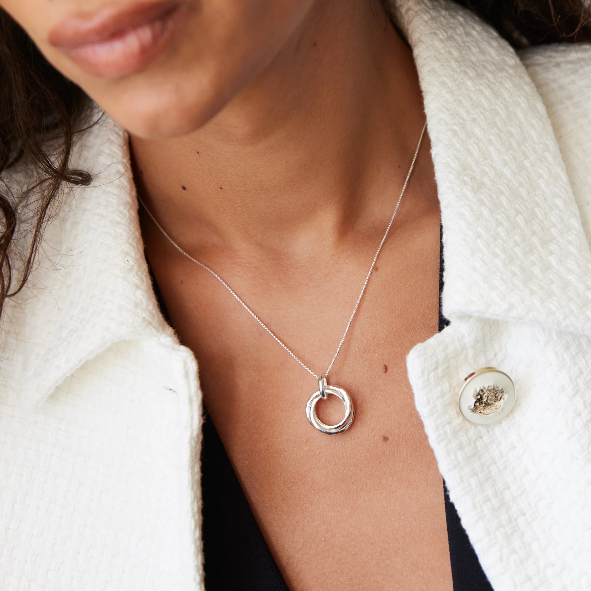 The distinctly contemporary ambience of this rhythmic pendant makes it the perfect companion for modern women on the go. High-polished sterling silver has been formed into a delicate three-ring pendant in the style of a quintessential Russian wedding ring. It looks extra heavenly when paired with a set of ethereal Georgia Bangles.