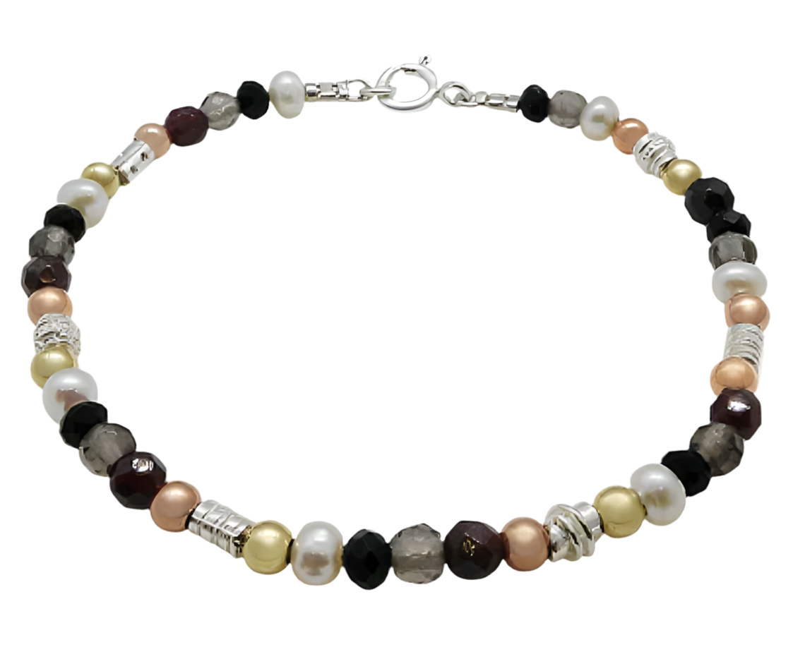 Sterling Silver, Gold Filled, Oynx, Smokey Quartz, Garnet, Pearl bracelet