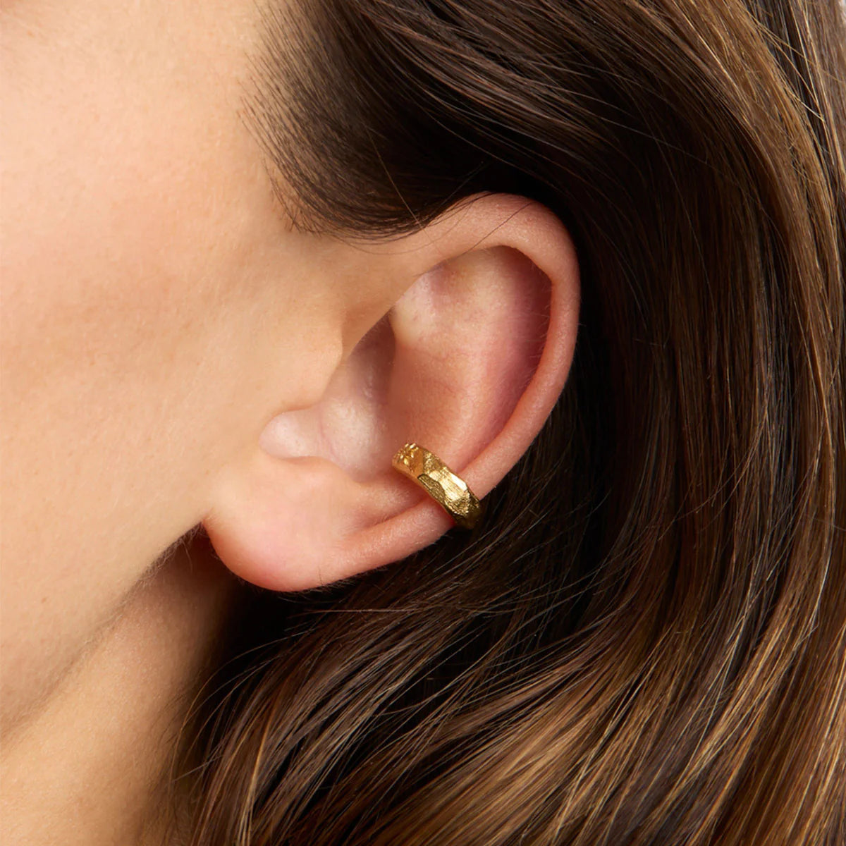 Add a golden statement to your ear stack with our Desert Ear Cuff. Featuring a minimalistic sandblasted finish, this cuff design emulates the unique shapes and forms of the desert landscape. Designed to be worn on the mid-helix, there is no piercing necessary to wear this piece! Effortlessly elevate any meaningful ear stack with this golden cuff.