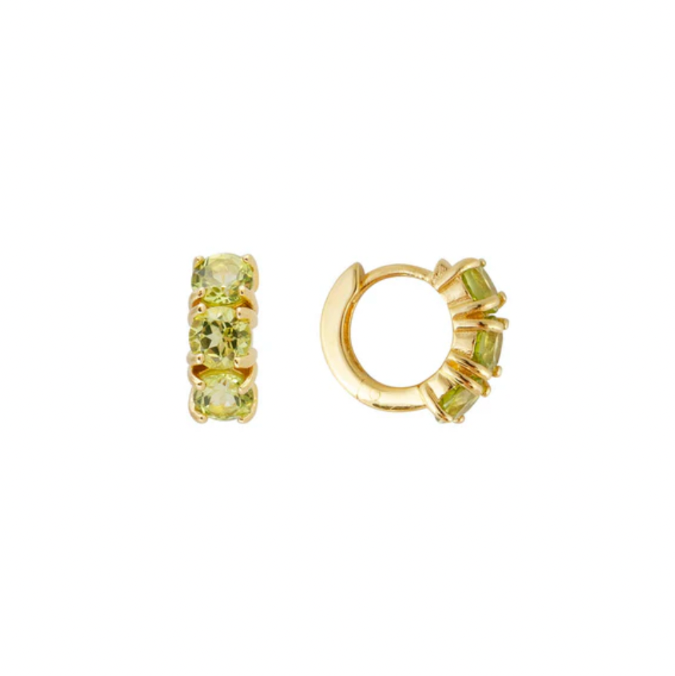 Known as “the Evening Emerald” because of its sparkling green hue, peridot looks good any time of day. These gemstone huggies feature 3 round faceted peridot stones that will illuminate your face.