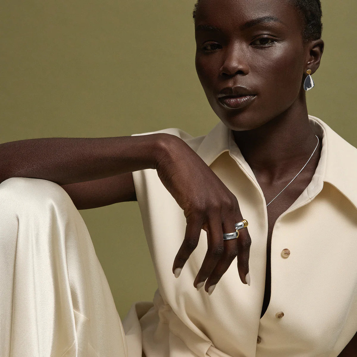 Inspired by Paris’s iconic bridges, this effortlessly glamorous ring is a potent symbol of connection. Her three central yellow gold plated ‘bridges’ span the width of the sterling silver half-round band, creating an elegant two-tone aesthetic. Thanks to her design versatility, the Pont D’Or, meaning Bridge of Gold, is perfect for bringing your gold and silver ring stack together.