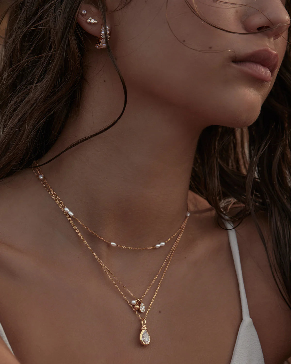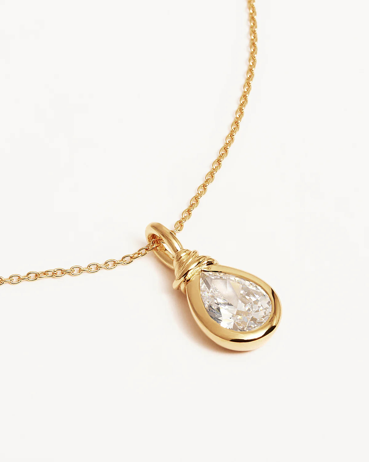 Our 18k Gold Vermeil Soul Searching Necklace - Crystal Mist isinspired by the stillness of winter and quiet moments of self-discovery by the sparkling ocean. Go within to find your peace with this delicate keepsake, featuring a pear-cut sparkling cubic zirconia.