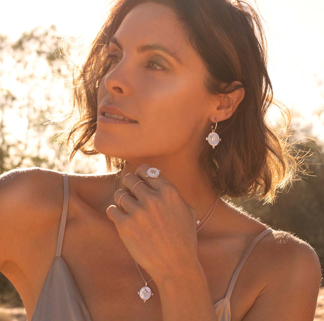 Our Temple Moon Small Earrings are made with gorgeous Mother of Pearl combined with White Topaz Stones laid within geometric patterns taken from Indian temples and places.